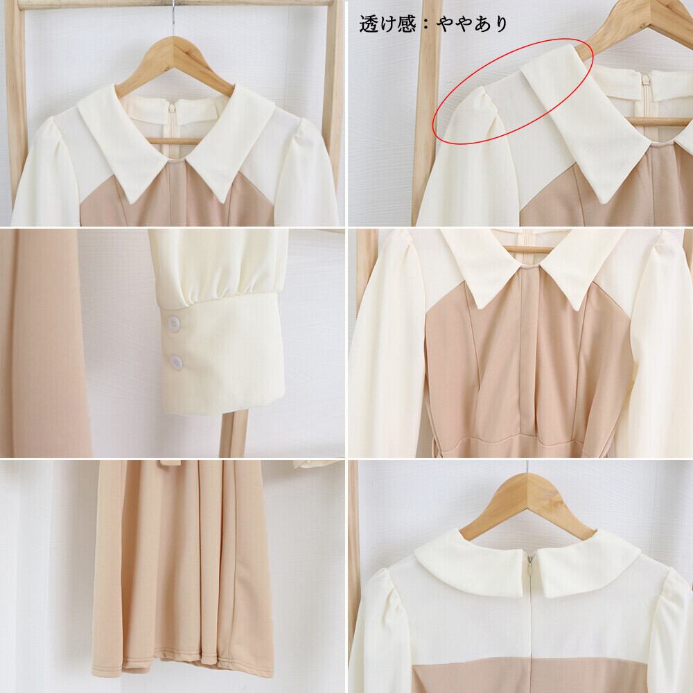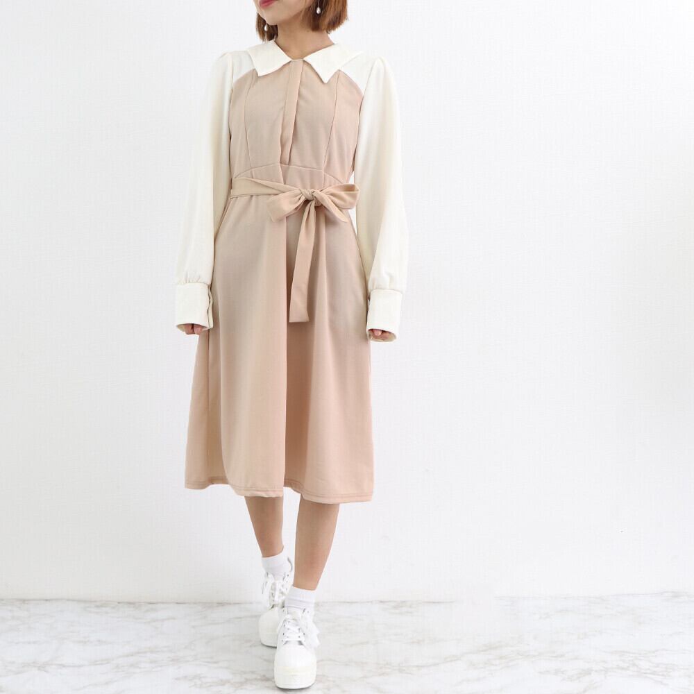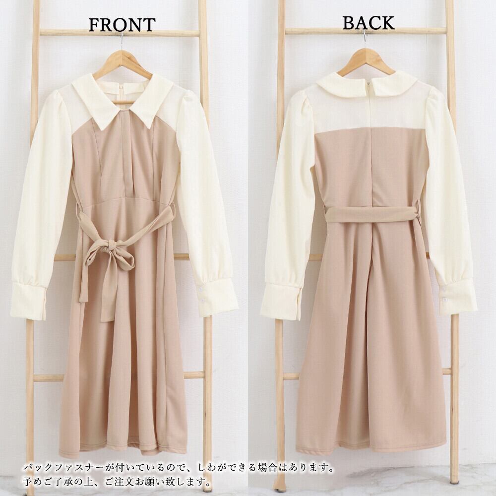 軽やかでやや薄手の生地感、清楚なイメージを与えるミディアム丈レイヤード風切り替えワンピース 折り襟はきちんと感があって、ウエストマークベルトとフレア裾のAラインシルエットは着やせしつつオトナ女子っぽさを引き立ててくれる