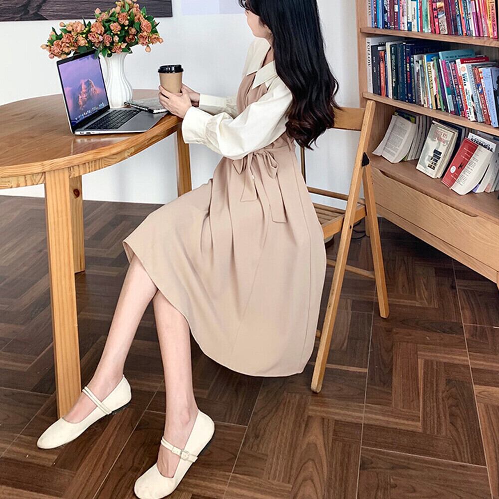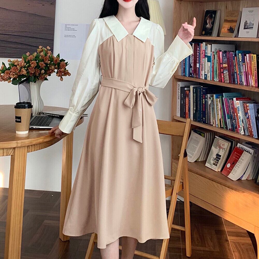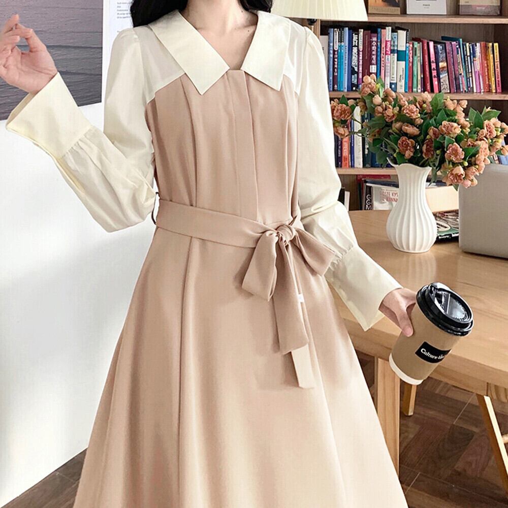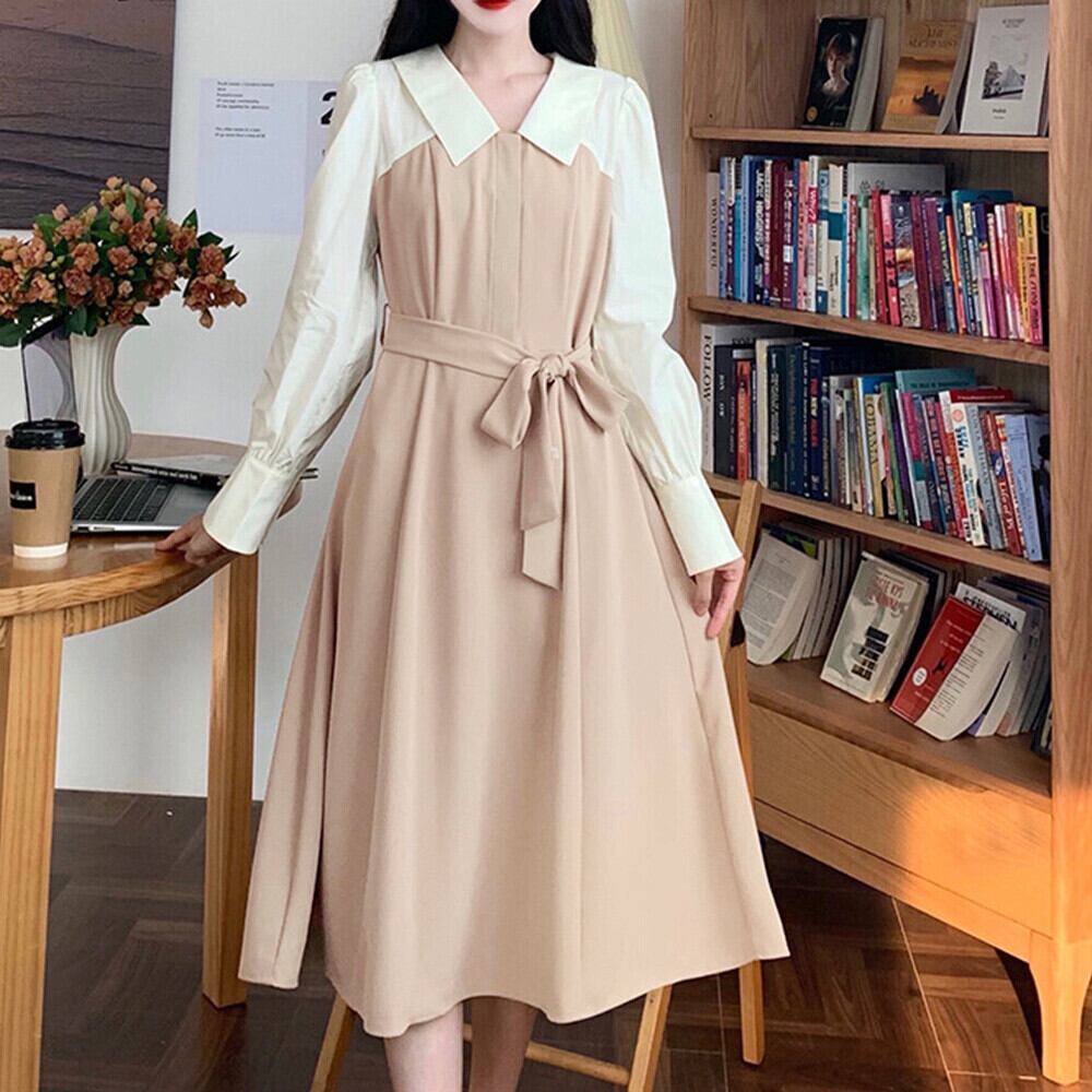 Aライン 切り替えワンピース 襟付き ロングワンピース 膝丈 きれいめ 春秋 フレアワンピース 長袖 上品清楚ワンピース シャツワンピース春 オフィスカジュアル