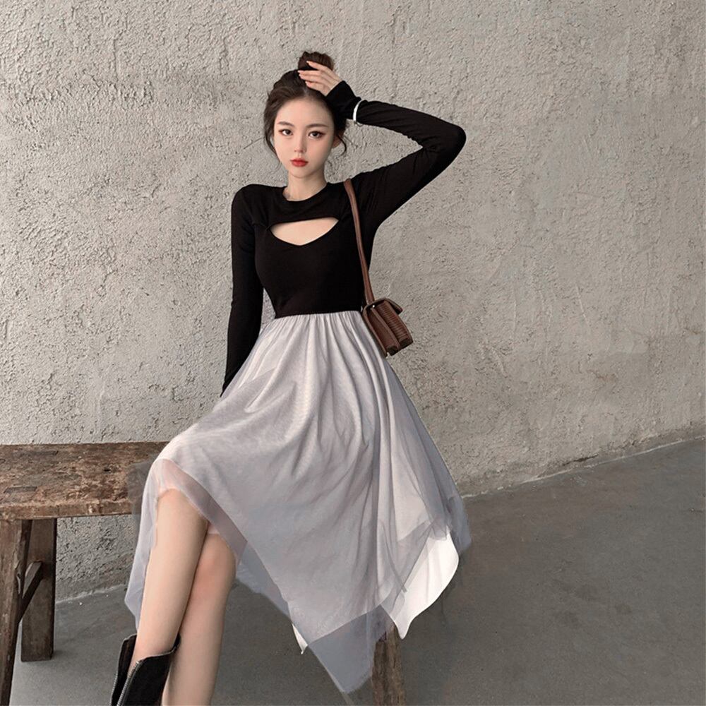 おしゃれ 異素材MIX チュールワンピース 長袖 ミニワンピ 着やせ 可愛い 春秋ワンピ カジュアル 胸元セクシー 韓国